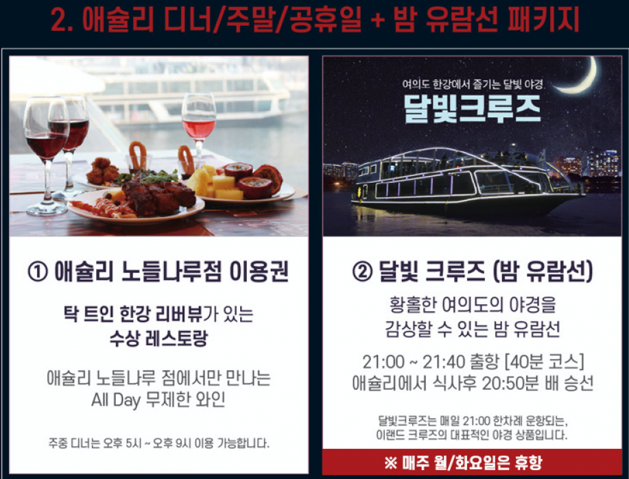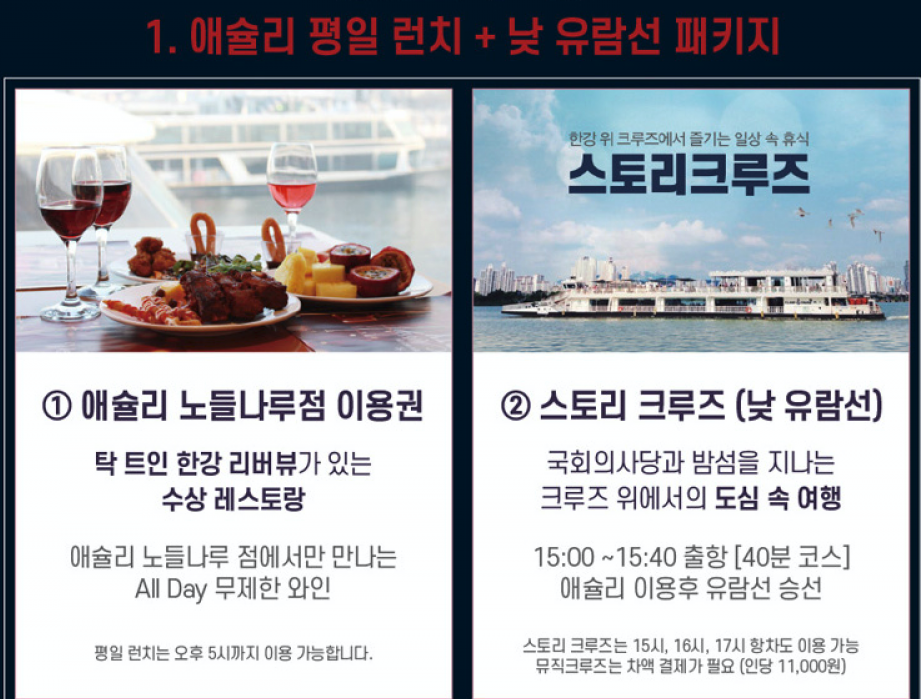 한강 유람선 티켓+애슐리 식권을 구매해 보세요! 고급 뷔페도 드시고 낭만적인 유람선도 탑승할 수 있답니다.