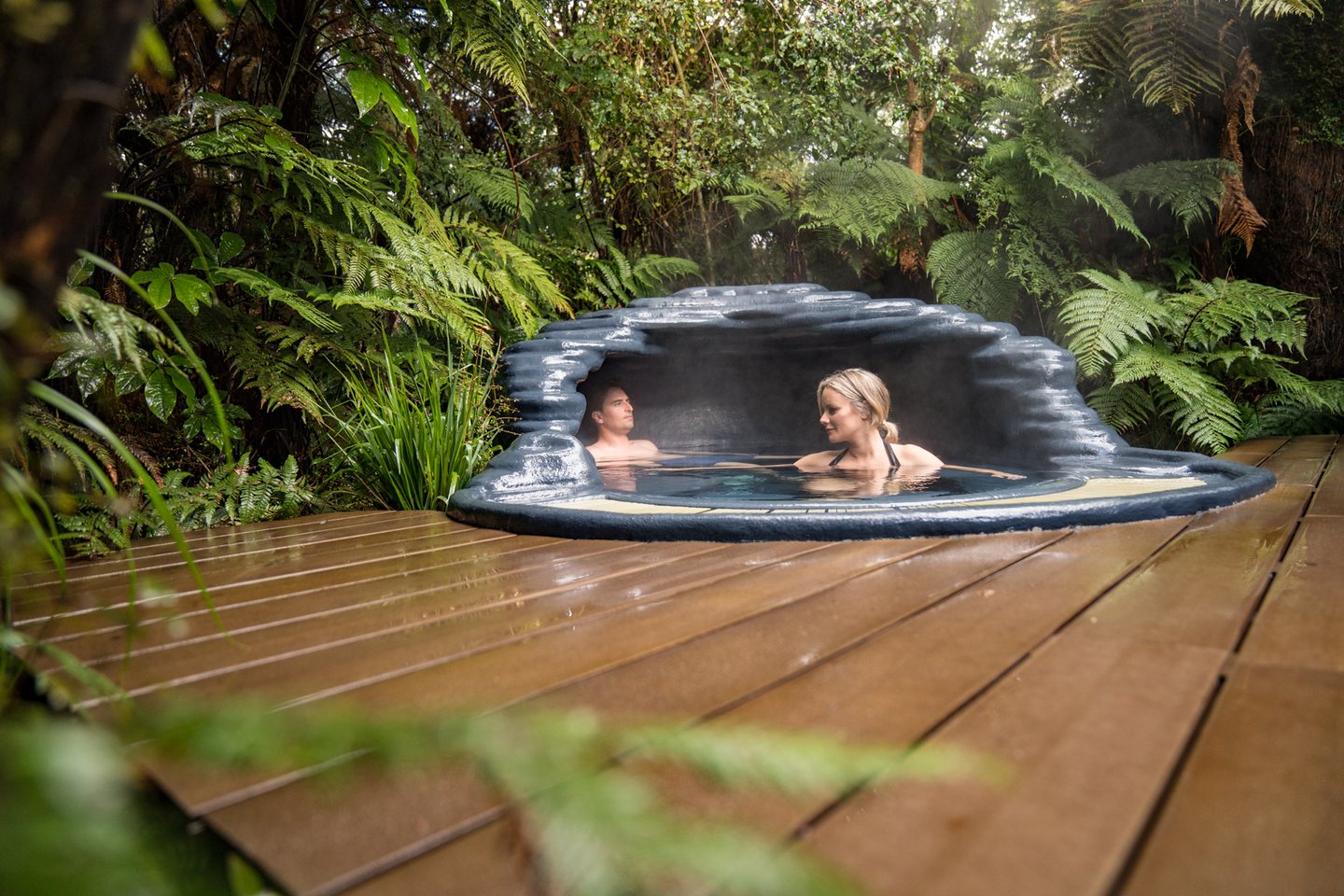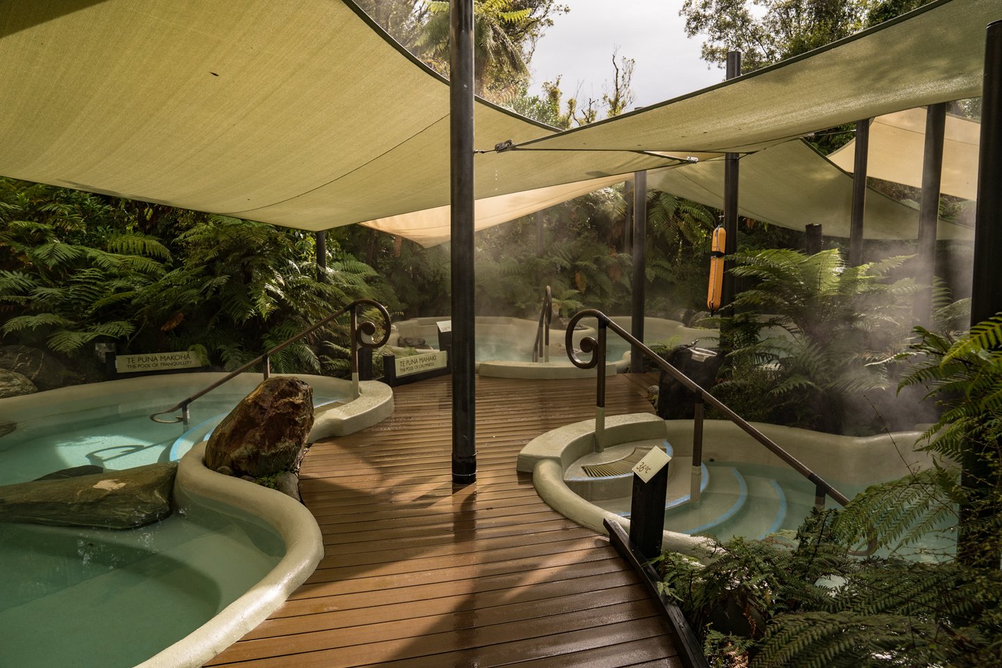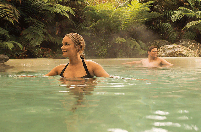 초록색 가득한 열대 우림의 한 가운데에서 온천욕을 즐겨보세요.
