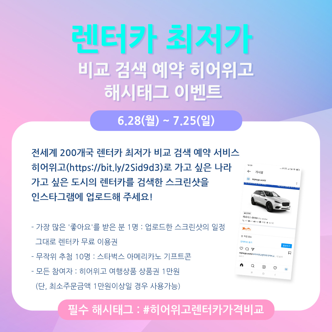 전세계 200개국 렌터카 최저가 비교 검색 예약 서비스 히어위고(https://bit.ly/2Sid9d3)로 가고 싶은 나라 가고 싶은 도시의 렌터카를 검색한 스크린샷을 인스타그램에 업로드해 주세요!