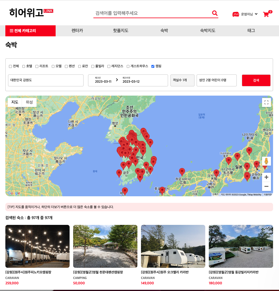숙박 [TIP] 지도를 움직이거나, 하단의 더보기 버튼으로 더 많은 숙소를 볼 수 있습니다. 더보기 +
