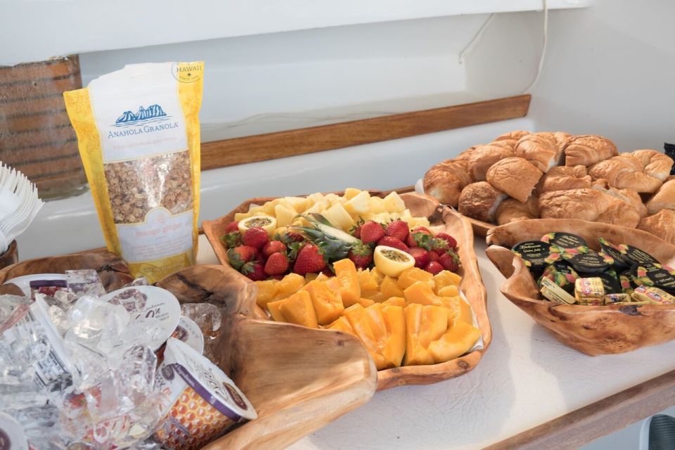 선상에서 음료와 열대과일과 함께 휴식을 취하세요.