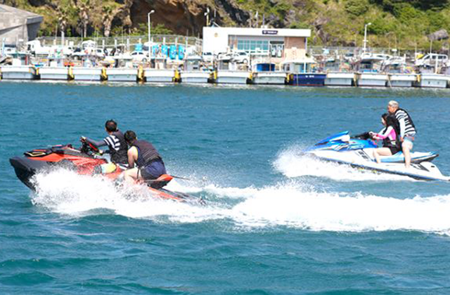제주도의 푸른 바다에서 제트스키를 타며 시원한 물살을 갈라보세요.