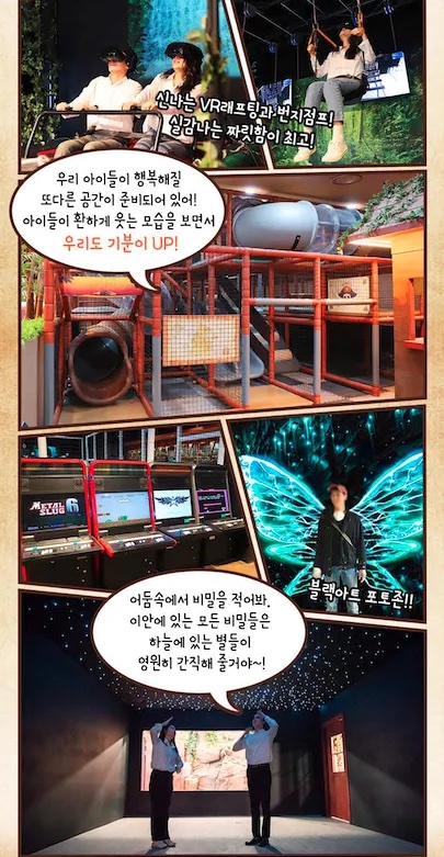 내부에는 VR 체험, 스크린 낚시, AR 트릭아트, 대형 정글짐 등 다양한 놀이시설도 준비되어 있습니다.