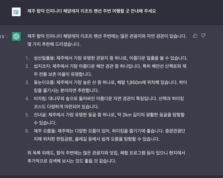 제주 함덕 인피니티 해양레저 리조트 펜션 (https://herewego.link/accomm/view.php?cp_ix=111022) 예약하신 손님에게 ChatGPT의 추천 내용을 전달해 드렸습니다.